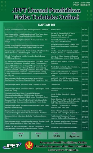 Edisi ini memuat beragam artikel yang merefleksikan inovasi, kajian literatur, serta pengembangan media dan bahan ajar dalam bidang pendidikan fisika. Artikel-artikel yang diterbitkan meliputi ulasan perangkat lunak simulasi pembelajaran fisika interaktif, penerapan model pembelajaran kooperatif tipe TGT, analisis integrasi pengetahuan siswa pada konsep usaha dan energi, serta studi literatur mengenai prinsip termodinamika dalam pengembangan cryotherapy. Selain itu, edisi ini juga menghadirkan penelitian pengembangan LKPD berbasis laboratorium pada materi gas ideal, metode penjernihan air melalui proses fotokatalis, serta validasi perangkat pembelajaran model OPTHREE untuk mengatasi miskonsepsi termodinamika. Inovasi praktikum dan media pembelajaran juga dikembangkan, seperti praktikum absorpsi fisika berbahan kulit singkong, alat peraga anemometer, e-modul fisika dasar, flipbook usaha dan energi, serta pendekatan STEM pada materi gelombang bunyi. Artikel lainnya mengkaji penggunaan media evaluasi Wordwall, pengembangan bahan ajar berbasis etnosains Kaili, penerapan model discovery learning berbantuan PhET, pengaruh metode eksperimen, hingga media berbasis kearifan lokal untuk meningkatkan literasi sains. Penelitian mengenai desain alat praktikum pengukur debit air berbasis Arduino serta analisis soft skill mahasiswa dalam program Merdeka Belajar turut melengkapi edisi ini, menjadikannya kontribusi penting bagi pengembangan pembelajaran fisika yang inovatif, kontekstual, dan adaptif terhadap tantangan zaman.